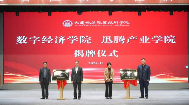 揭牌仪式上,大连枫叶职业技术学院院长杨捷与滨海迅腾集团董事长邵荣强共同为“数字经济产业学院”揭牌;大连枫叶职业技术学院副院长高成林与滨海迅腾集团党副总裁韦钰共同为“迅腾产业学院”揭牌,标志着实体运营产业学院启航,校企双方将围绕打造产教融合示范引领项目谱写新篇章。